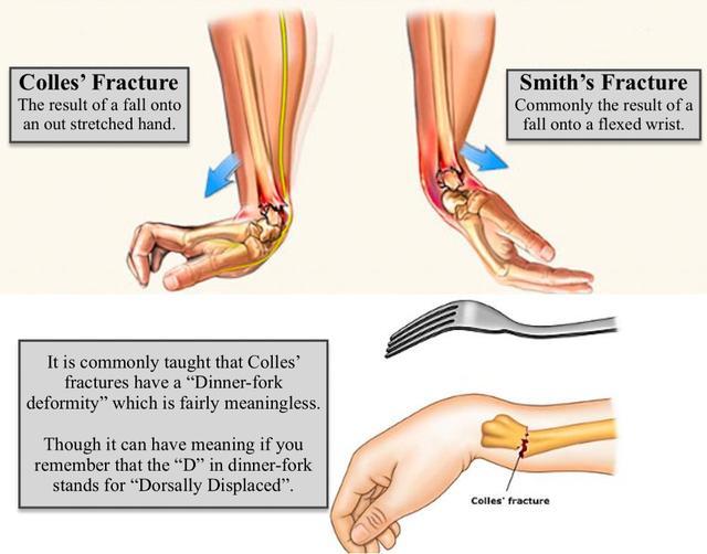 大家都知道,我们摔倒下意识反应就是手撑地。如果是年纪比较大的老人,本身就有一些骨质疏松,摔的时候身体协调能力又不是很好,这个时候他手着地往下一戳,如果是往后手背先着地,叫Smith骨折;手心着地就容易出现Colles骨折,出现餐叉样畸形。如果骨折复位后感觉比较稳定,打石膏固定一段时间就可以,个别情况可能还需要手术复位。