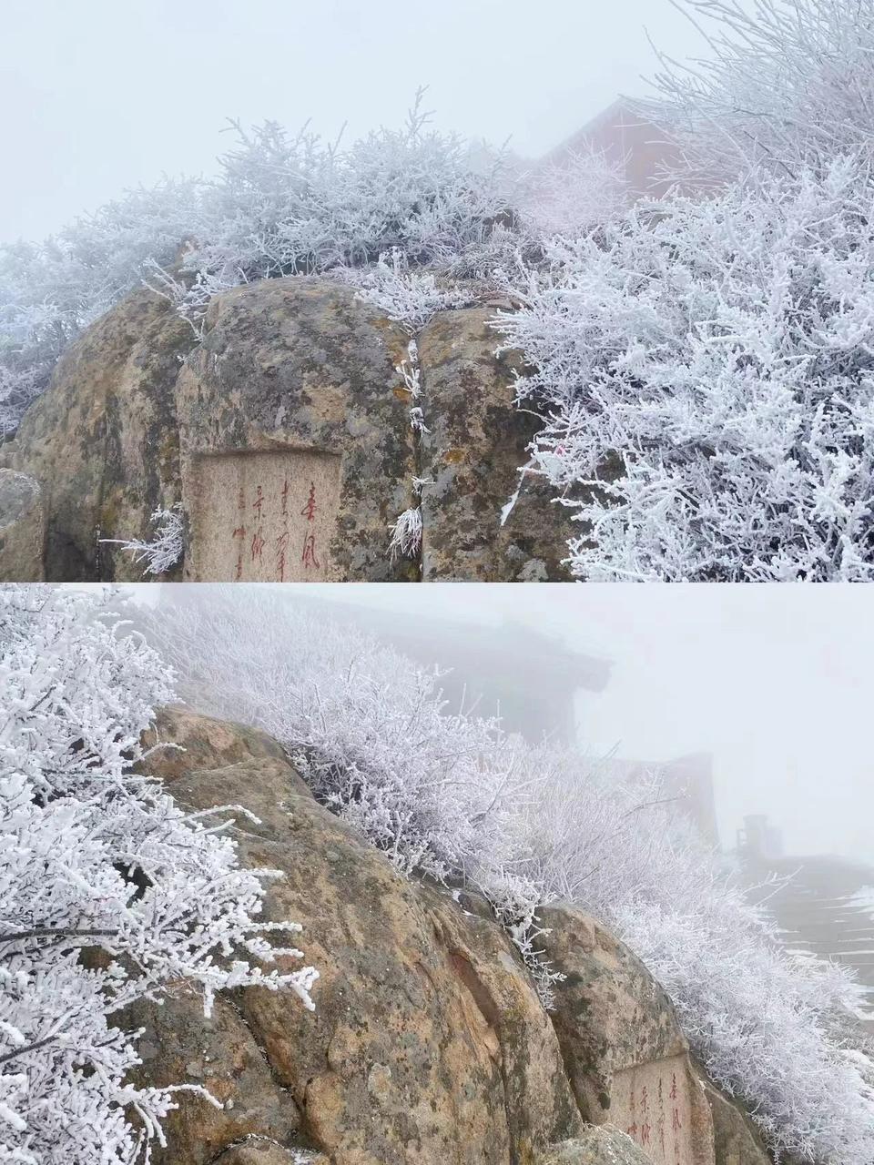 “浓霜中夜零,千林成雾凇。”12月13日,受低温冷空气影响,泰山之巅现雾凇奇观,冰雕玉砌、晶莹闪烁的雾凇缀满枝头,一树树、一丛丛,甚是好看。云雾笼罩下,岱顶开启仙境模式。