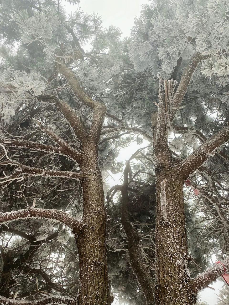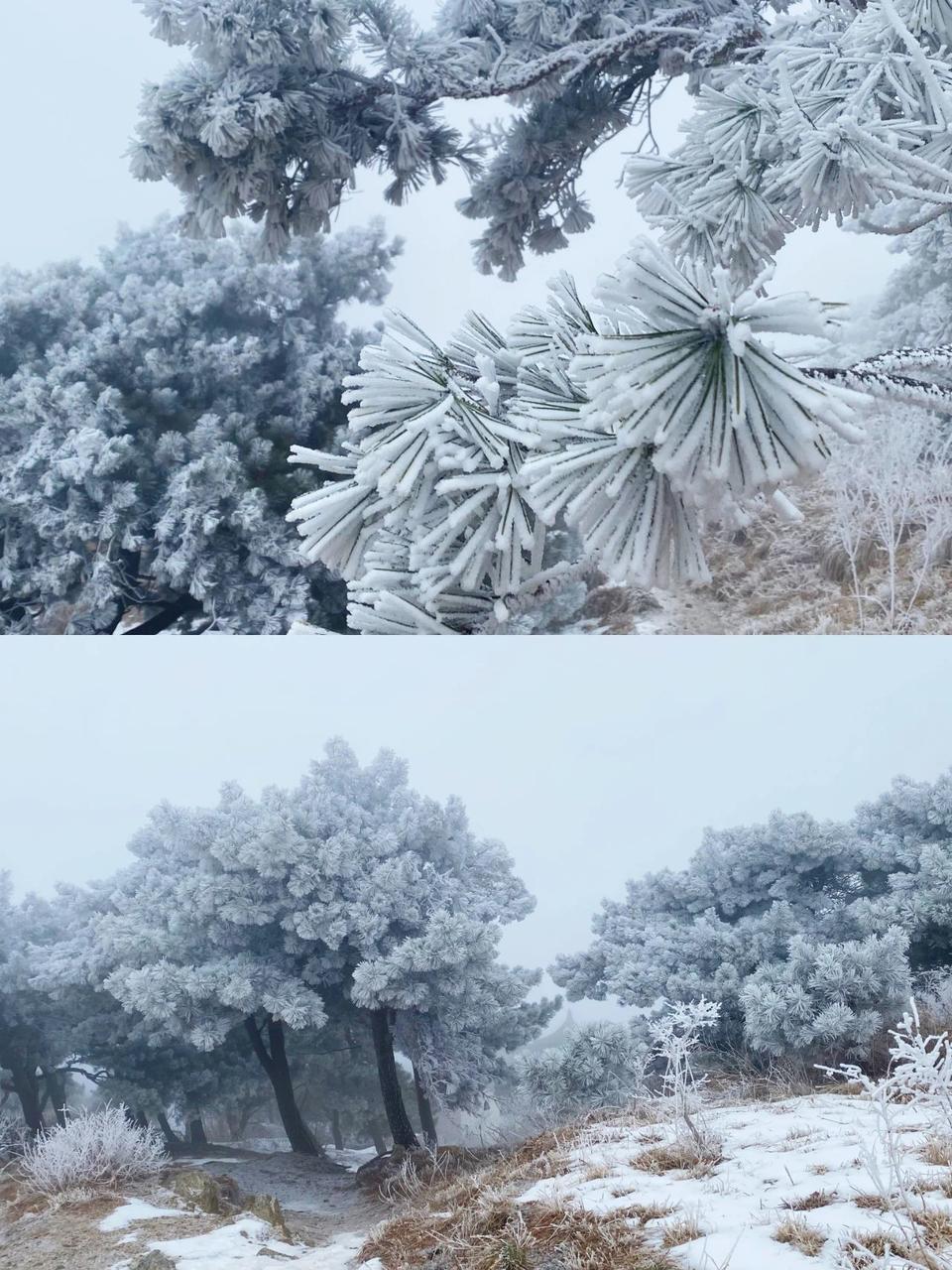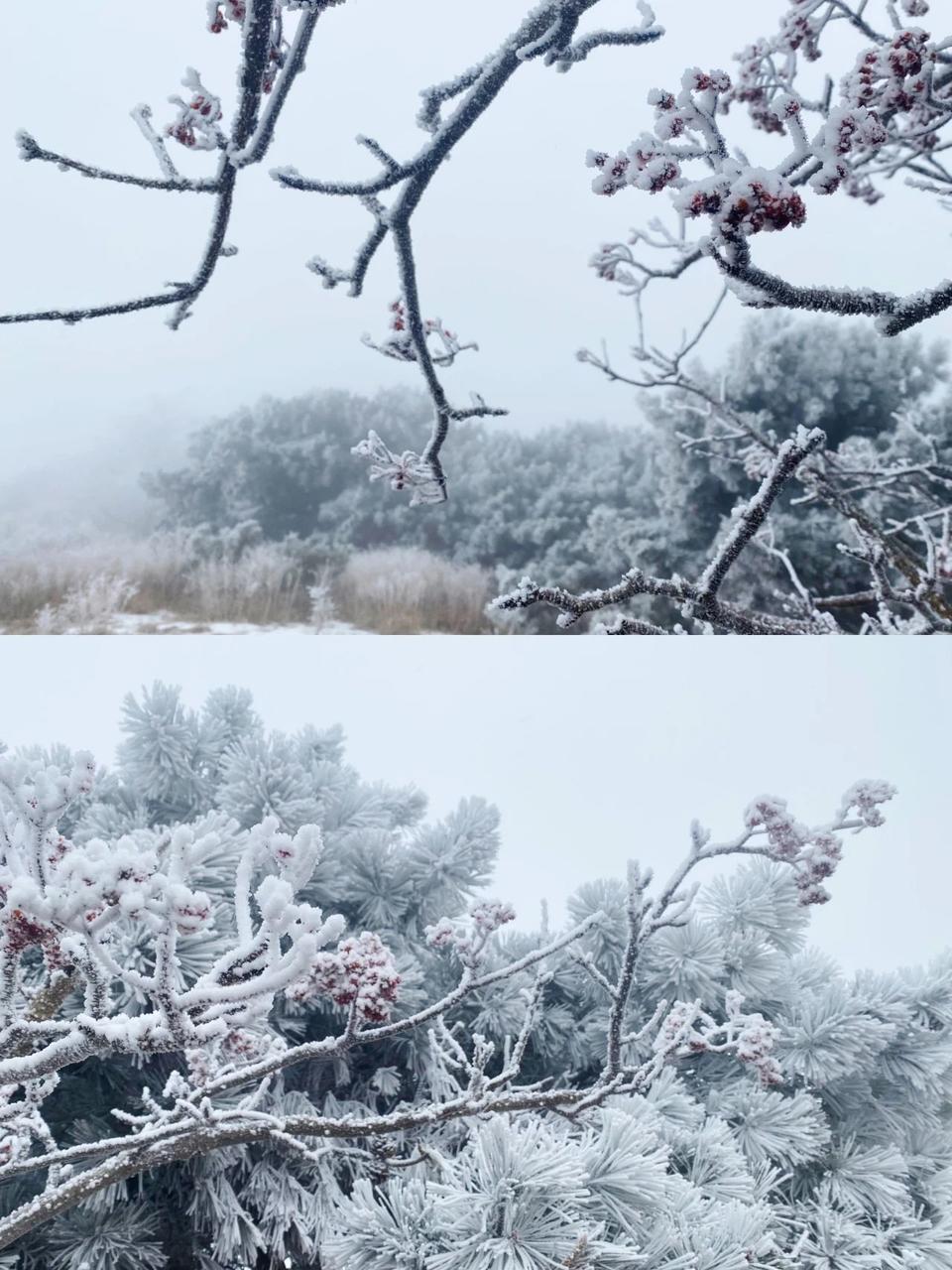 雾凇凝结让林木绽开银花,极目远眺,山峦与云雾虚实相映、若隐若现,皓然一色,呈现出诗情画意。冰雕玉砌、晶莹闪烁的雾凇缀满枝头,一树树、一丛丛,甚是雅致。