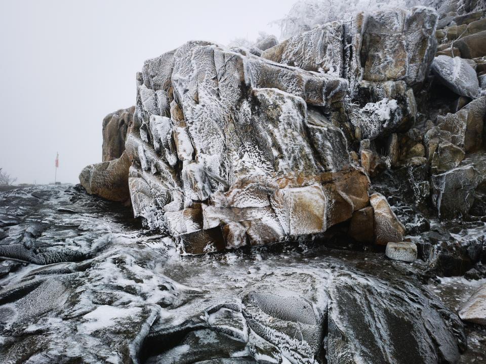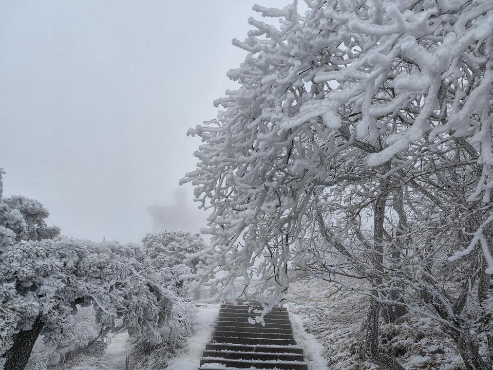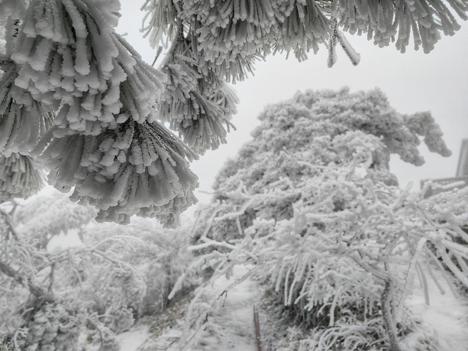 不过,从景区工作人员传来的实拍照片看,眼下的泰山景区是真美。整座泰山已经完全进入一个冰雪世界,降雪量之大,近一二十年罕见。未覆盖冰雪的似乎只有垂直的部分崖壁。拍摄于泰山之巅南天门的一则视频则显示,树枝上挂满冰雪,样子颇像无数鹿角,晶莹剔透的。据视频分析,山顶风力应该不算大,树梢只是微微晃动。