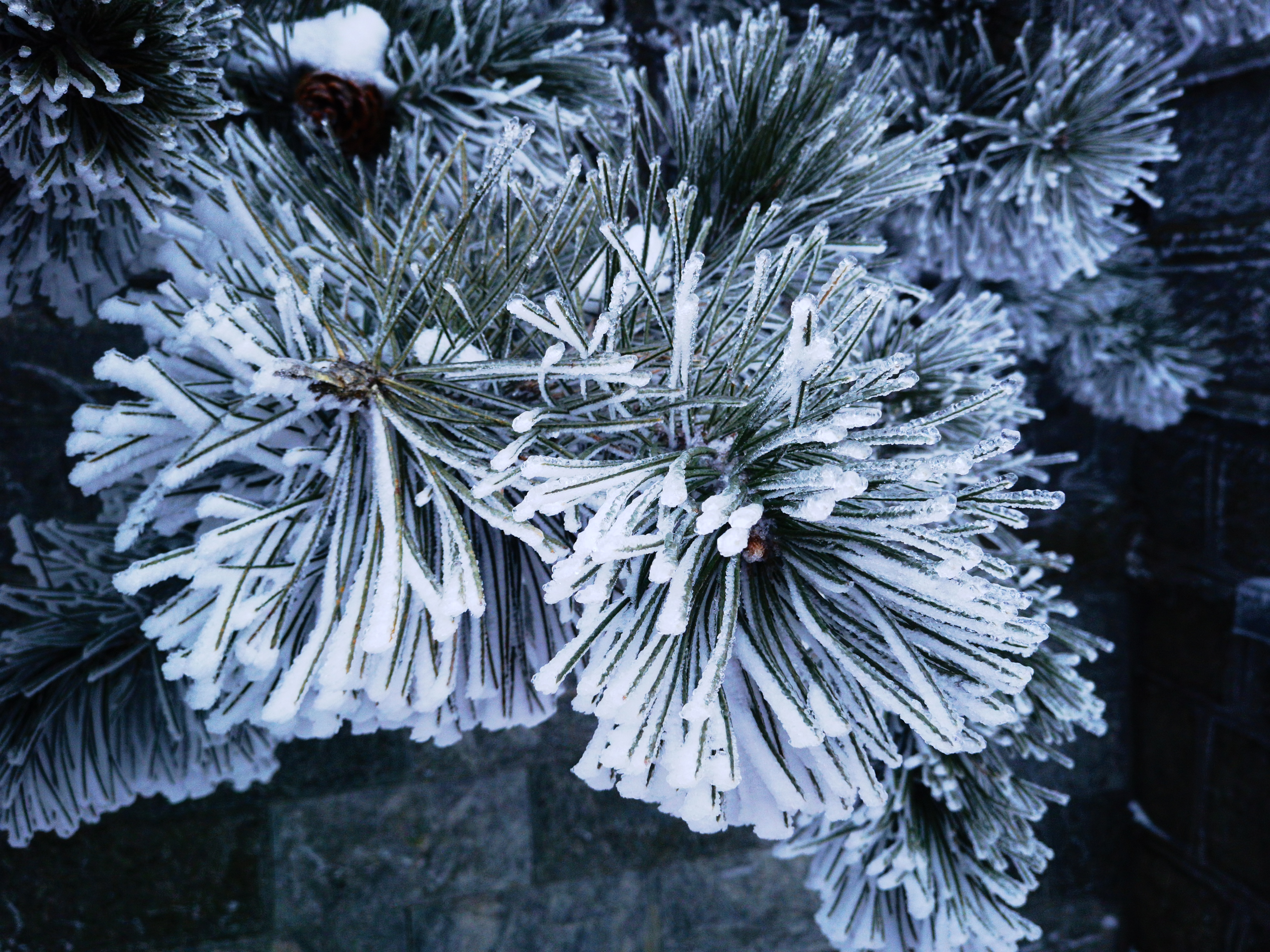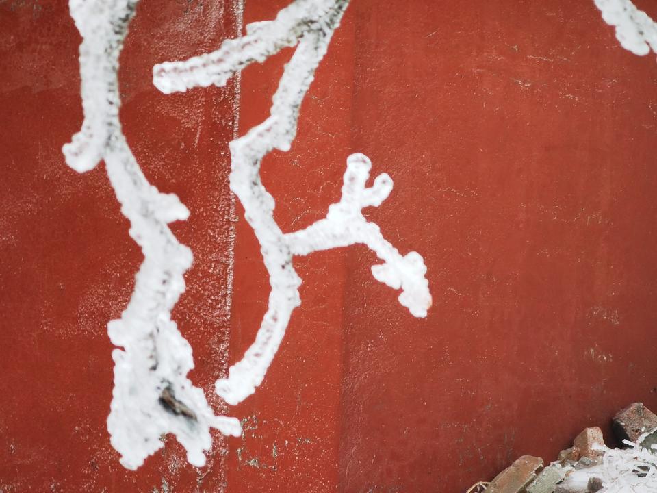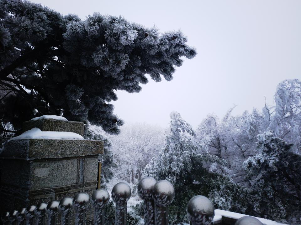 泰山景区的满眼白色中,偶尔闪出一块块红,一块块绿,那是深山古刹红墙和门窗玻璃的颜色。此时的泰山雪松,则呈现一种苍苍的墨绿色,玉雪压覆其上,形成强烈的黑白对比效果。
