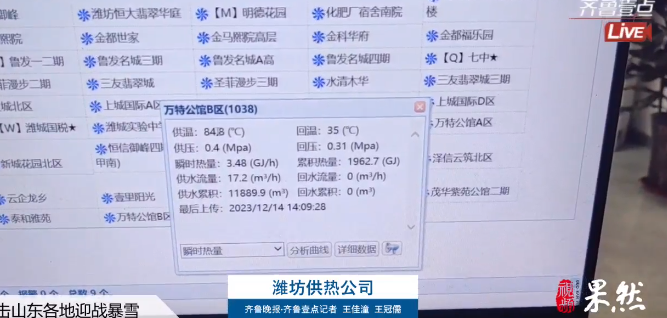 12月14日,齐鲁晚报·齐鲁壹点记者来到潍坊供热一处供热公司,实地探访供热情况。供热公司相关负责人介绍,该供热公司负责为潍坊市区76个小区供热,总管网实时供热温度超过80℃。在调度中心,跟随记者的镜头,可以清楚看到每个锅炉的情况和温度实时情况,也可以清晰看到各个小区的情况,其中一个小区,供温84.8℃,回温35℃。