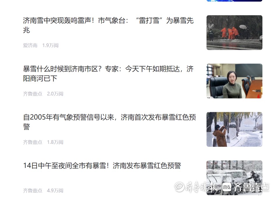据统计,专题浏览量破百万,其中《14日中午至夜间全市有暴雪!济南发布暴雪红色预警》阅读量达4.9万、《暴雪什么时候到济南市区?专家:今天下午如期抵达,济阳商河已下》阅读量达2万。