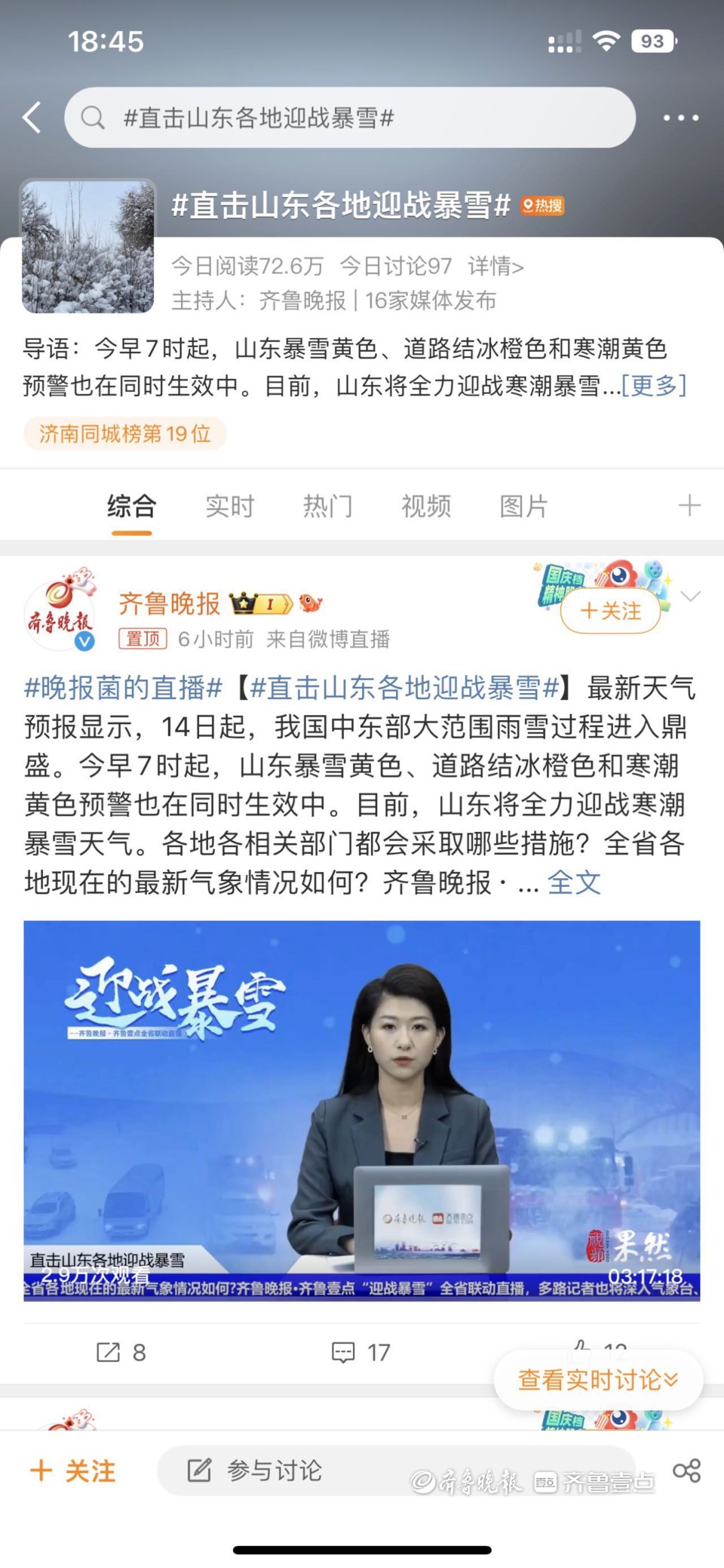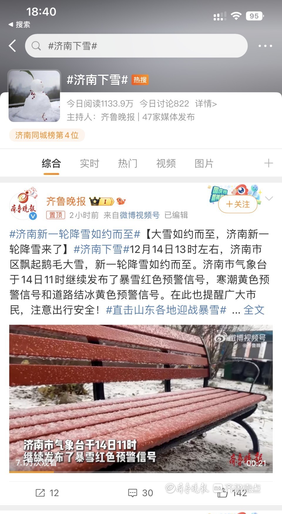 在新媒体平台,齐鲁晚报·齐鲁壹点开设#济南下雪##济南防范寒潮雨雪必要时景区关闭##受寒潮影响泰山景区暂停开放##直击山东各地迎战暴雪#等微博话题,其中,多个话题冲上微博热搜榜,#济南下雪#话题更是阅读量破千万、登上同城热搜榜第4名,#直击山东各地迎战暴雪#话题阅读量达72.6万,引起网友热议。