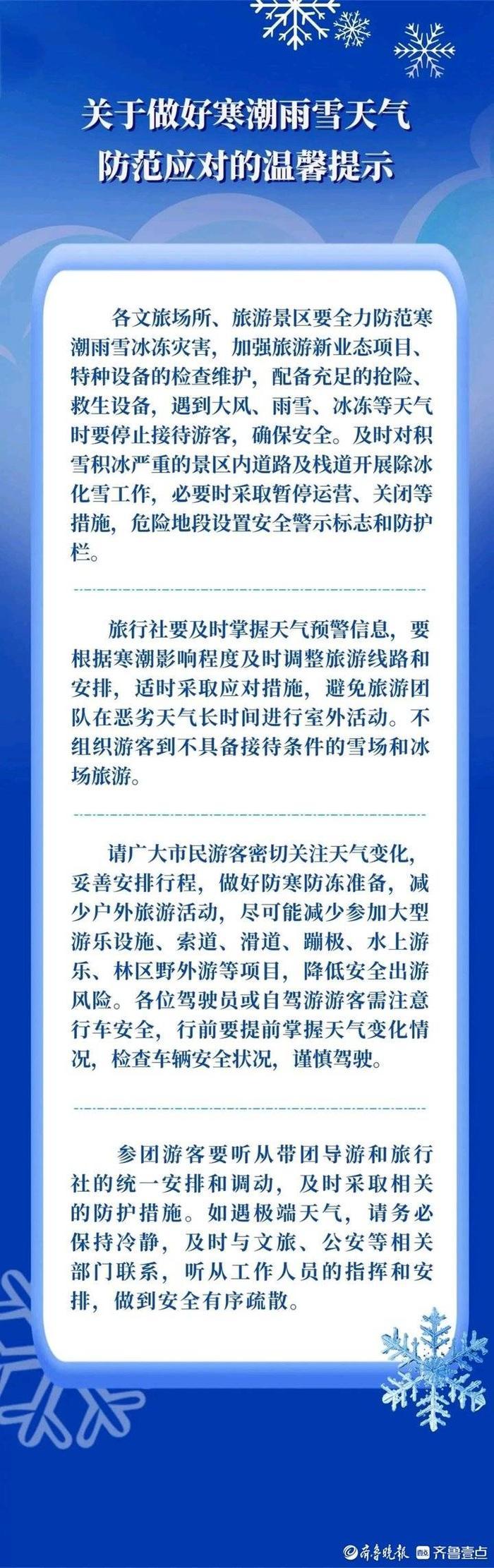 12月14日上午,济南市文化和旅游局发布《关于做好寒潮雨雪天气防范应对的温馨提示》,提出各文旅场所、旅游景区要全力防范寒潮雨雪冰冻灾害,遇到大风、雨雪、冰冻等天气时要停止接待游客,确保安全。