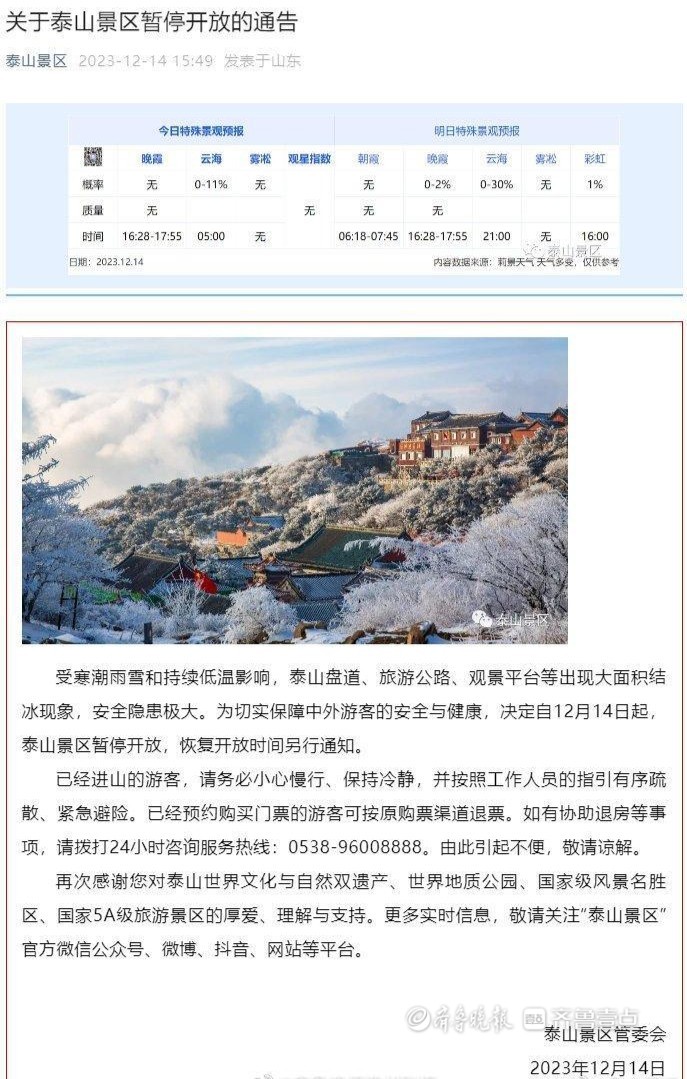 记者从泰山景区了解到,为切实保障中外游客的安全与健康,决定自12月14日起,泰山景区暂停开放,恢复开放时间另行通知。