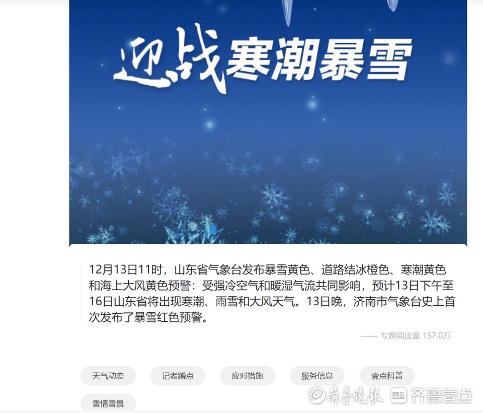 为了让用户可以第一时间了解到最全面的天气信息,齐鲁晚报·齐鲁壹点的专题早在13日晚就已初步搭建,专题涵盖天气动态、记者蹲点、应对措施、服务信息、壹点科普、雪情雪景等六个栏目,对雪情进行全方位报道,并做好市民安全提示。