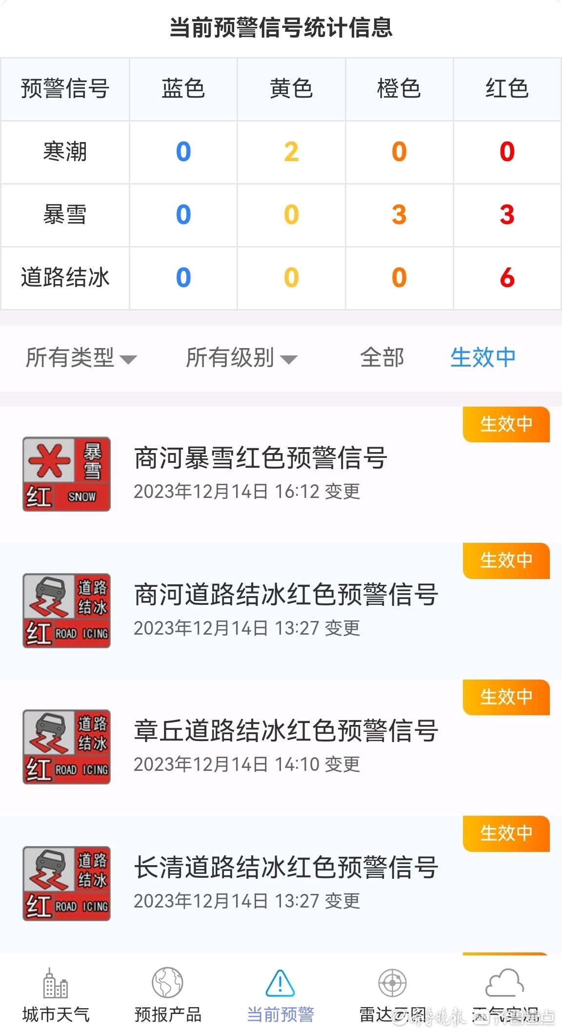 12月14日17时,济南市气象台官方公众号“济南市气象灾害预警信号”显示,济南市共有9个红色预警正在生效中。9个红色预警信号分别为:济南暴雪红色预警信号、商河暴雪红色预警信号、长清暴雪红色预警信号、济南道路结冰红色预警信号、商河道路结冰红色预警信号、章丘道路结冰红色预警信号、长清道路结冰红色预警信号、平阴道路结冰红色预警信号、济阳道路结冰红色预警信号