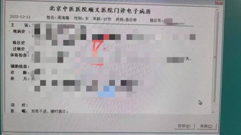 南都此前报道,12月12日晚,港星周海媚离世的消息得到最终确认,同时有网友注意到,疑似有周海媚生前最后一次就诊的抢救病历被泄露,引起关注。网传图片显示,12月11日,北京中医医院顺义医院急诊科接诊一名名叫周海媚的女性患者,年龄57岁。患者详细的身体状况、现病史、既往病史和体格检查等信息均清晰可见,引网友质疑泄露病历者行侵犯患者隐私。