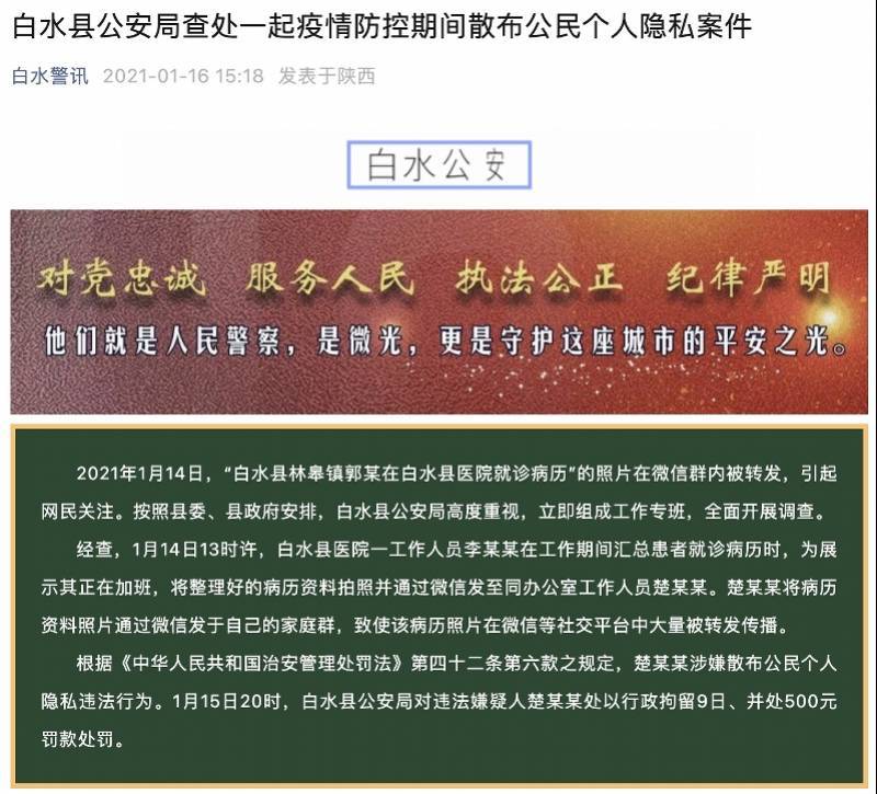 据陕西省渭南市白水县公安局通报,2021年1月,白水县医院一工作人员李某某在工作期间汇总患者就诊病历时,为展示其正在加班,将整理好的病历资料拍照并通过微信发至同办公室工作人员楚某某。楚某某将病历资料照片通过微信发于自己的家庭群,致使该病历照片在微信等社交平台中大量被转发传播。最终,楚某某因涉嫌散布公民个人隐私违法行为,被白水县公安局处以行政拘留9日、并处500元罚款处罚。