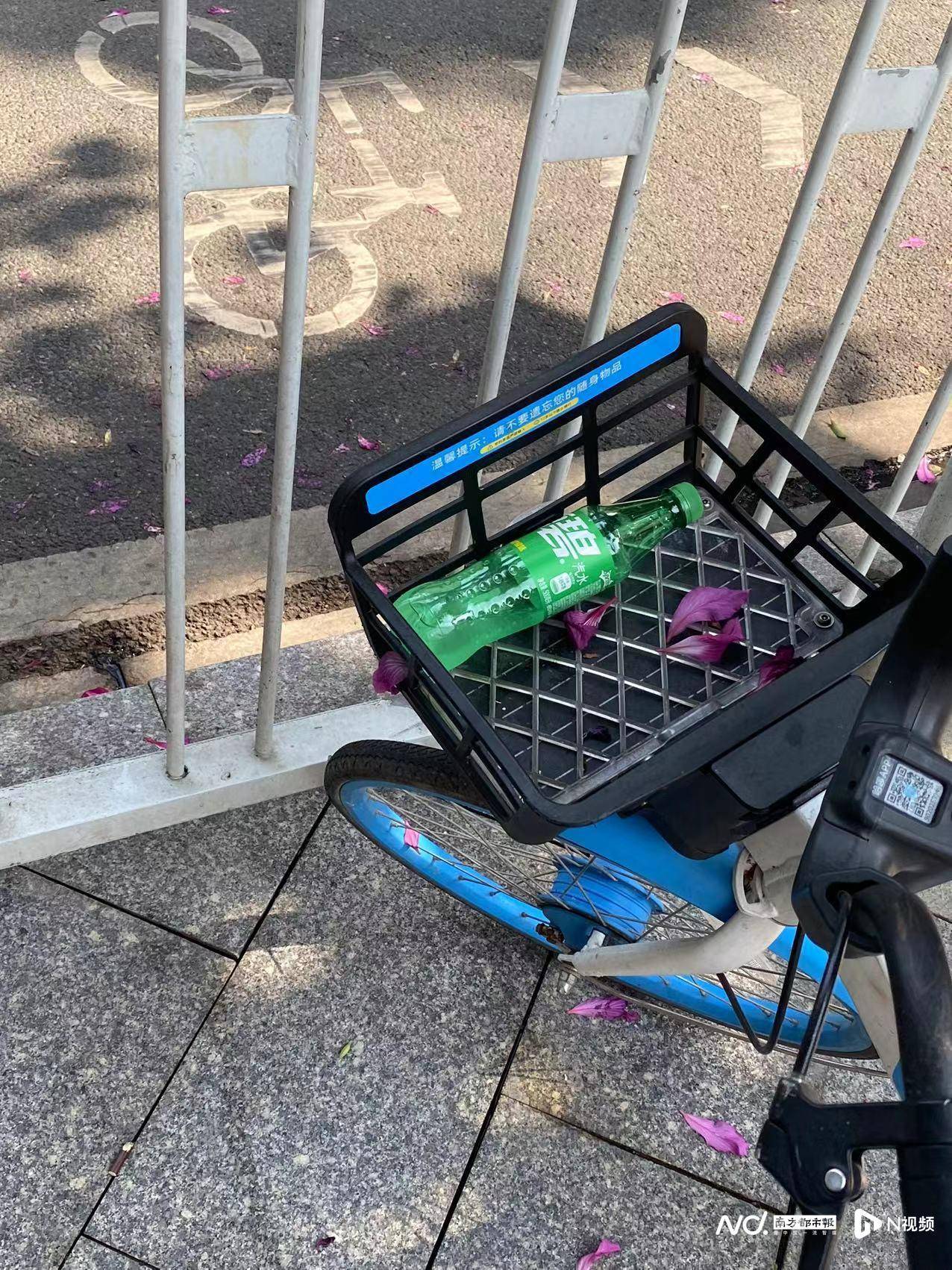 天河南附近,一辆共享单车上有塑料饮料瓶被丢弃。