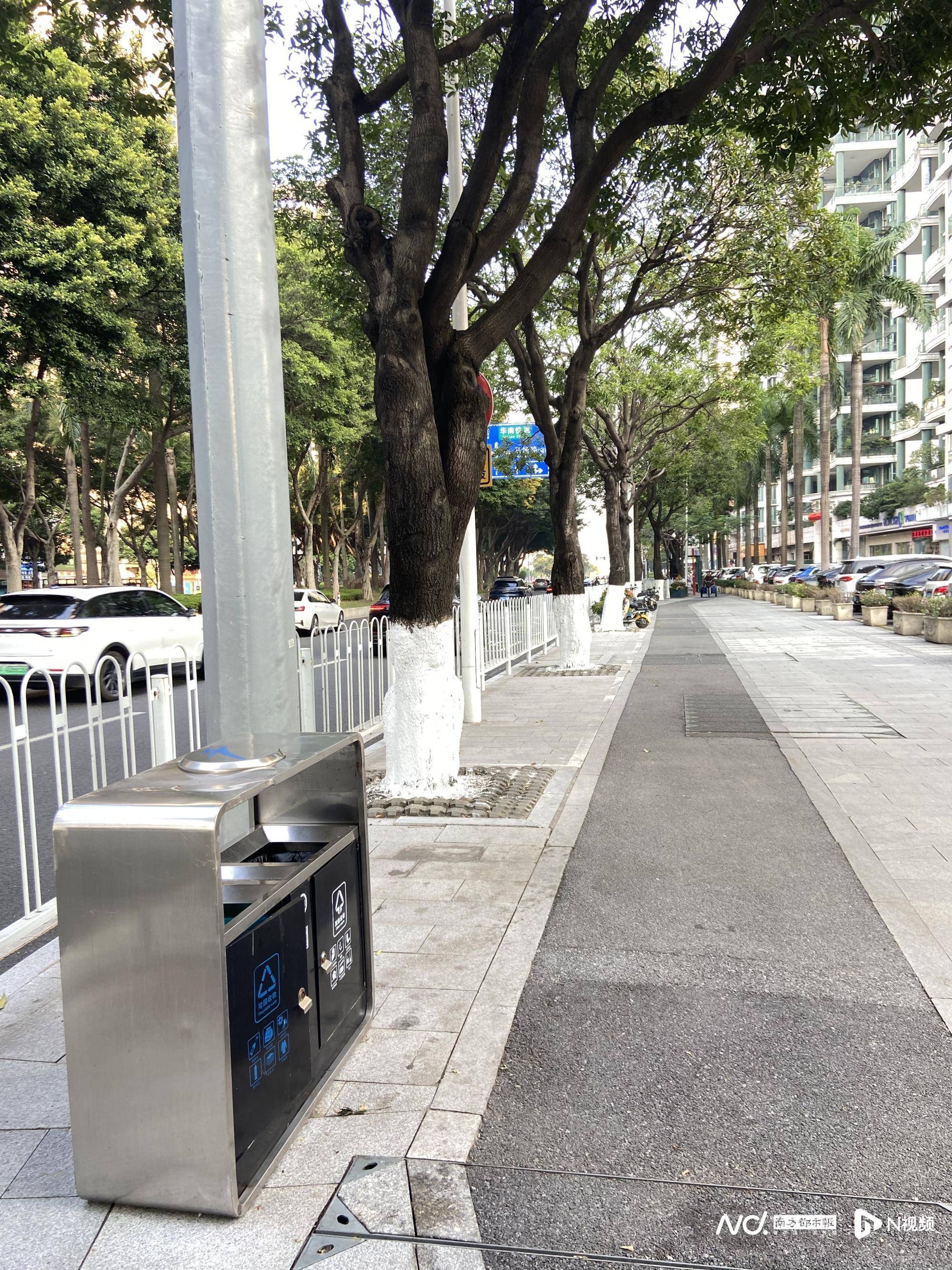 也有部分商圈附近垃圾桶较少。记者从天河智慧城地铁口出来后,沿着高唐路往北行走约500米,只见沿街人行道均被电动车占据,并未看见垃圾桶踪影。之后,记者由高唐路进入华观路,往东行走约一公里,除了沿路公交车站旁有一个垃圾桶,全程未发现其他垃圾桶设置。