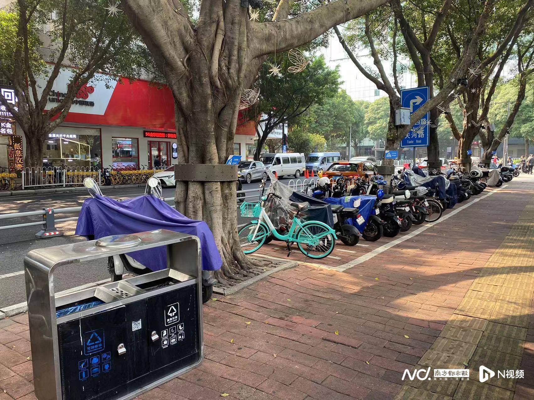 11月23日上午,记者沿着黄埔大道西步行,从广东国防大厦出发,途经石牌村、天河南、体育西路,一直到花城广场附近。记者观察到,几乎每个公交站点旁50米范围内均设有垃圾桶。但除此之外,部分垃圾桶位置并不显眼,且被各种车辆包围。天河南附近的部分共享单车变成“临时垃圾桶”,有塑料饮料瓶被留在了车筐里。