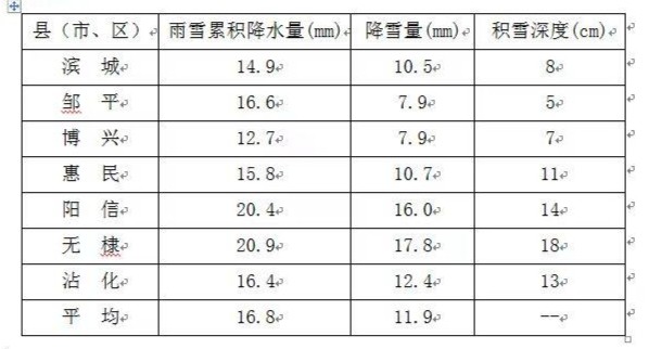 13日上午滨州开始出现小雨或雨夹雪,14日中午转雪,记者在滨州市气象台了解到,截止到14日18时,全市普降大雪或暴雪,有明显积雪和道路结冰。雨雪累积平均降水量16.8毫米,最大降水量20.9毫米,出现在无棣气象站;平均降雪量11.9毫米,最大降雪量17.8毫米,出现在无棣气象站;各站积雪深度5~18厘米,最大积雪深度亦出现在无棣气象站。