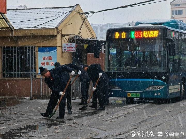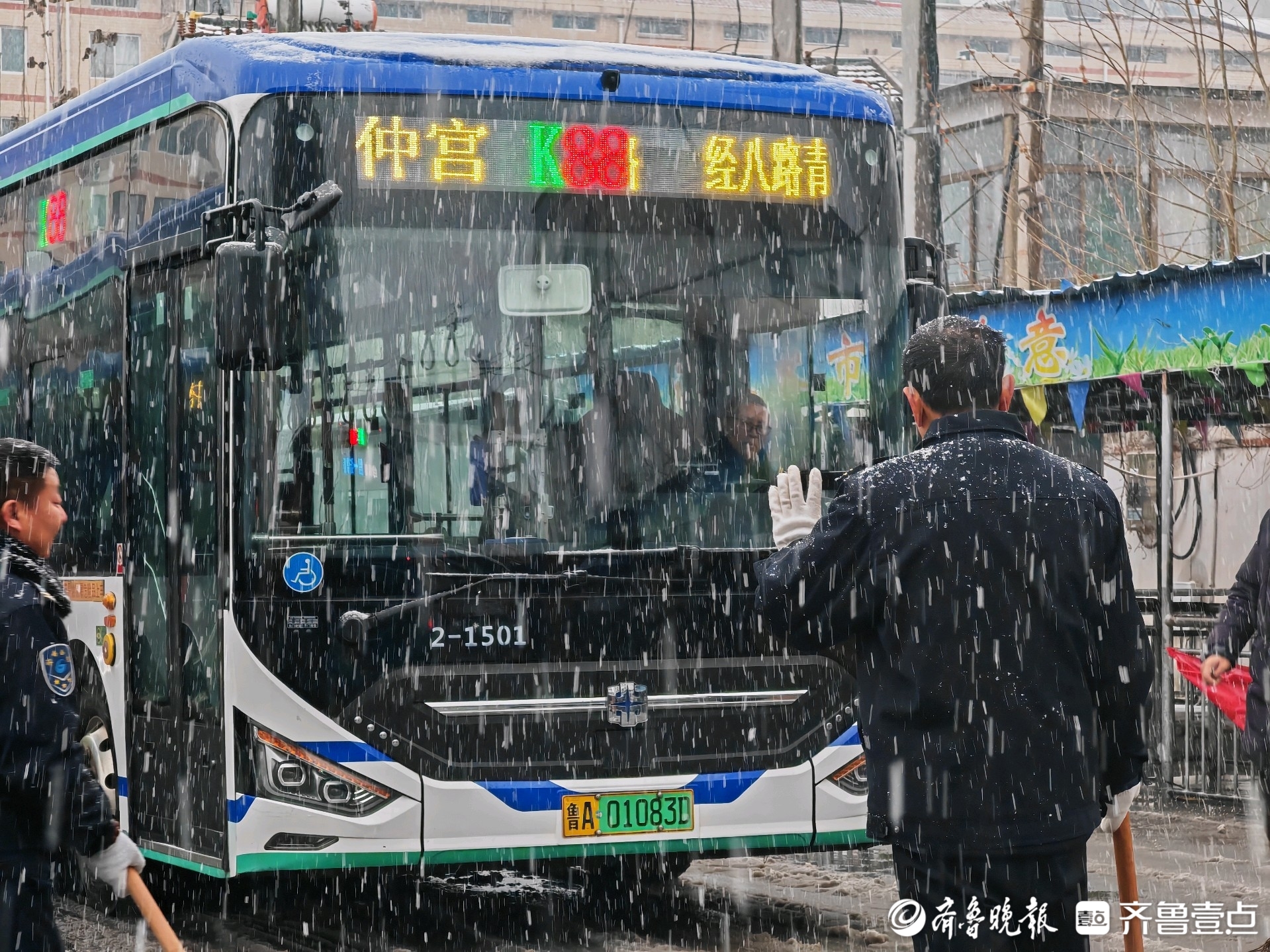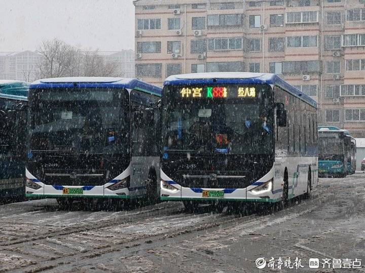 在济南市气象台发布暴雨红色预警后,济南公交就开始了部署。降雪开始后,城市公交投入最大运力。