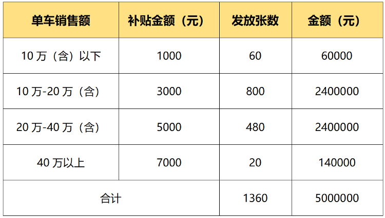 第二批汽车消费券金额共计500万元,共发放1360张,包括1000元消费券共计发放60张、3000元消费券共计发放800张、5000元消费券共计发放480张、7000元消费券共计发放20张。