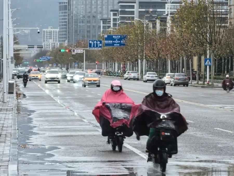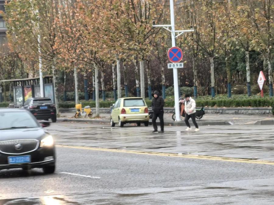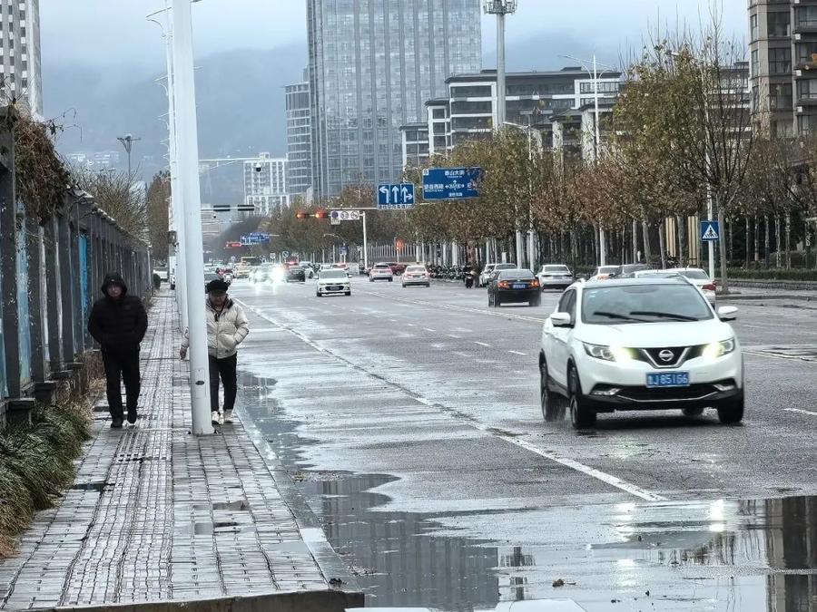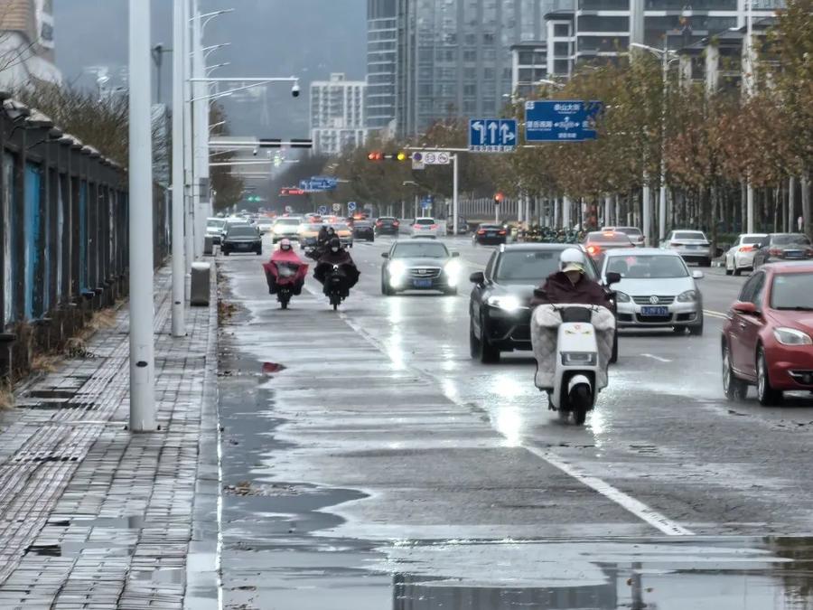 你来我往的车辆穿梭在泰城的道路上,雨水和雪花交织在一起,形成了一层薄薄的冰凌。车行驶在路上,发出咯吱咯吱的声音,人走在道路上,小心翼翼前行。