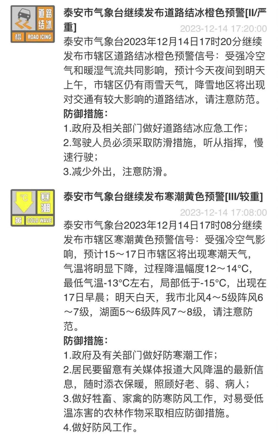 12月14日17时20分泰安市气象台继续发布市辖区道路结冰橙色预警信号: