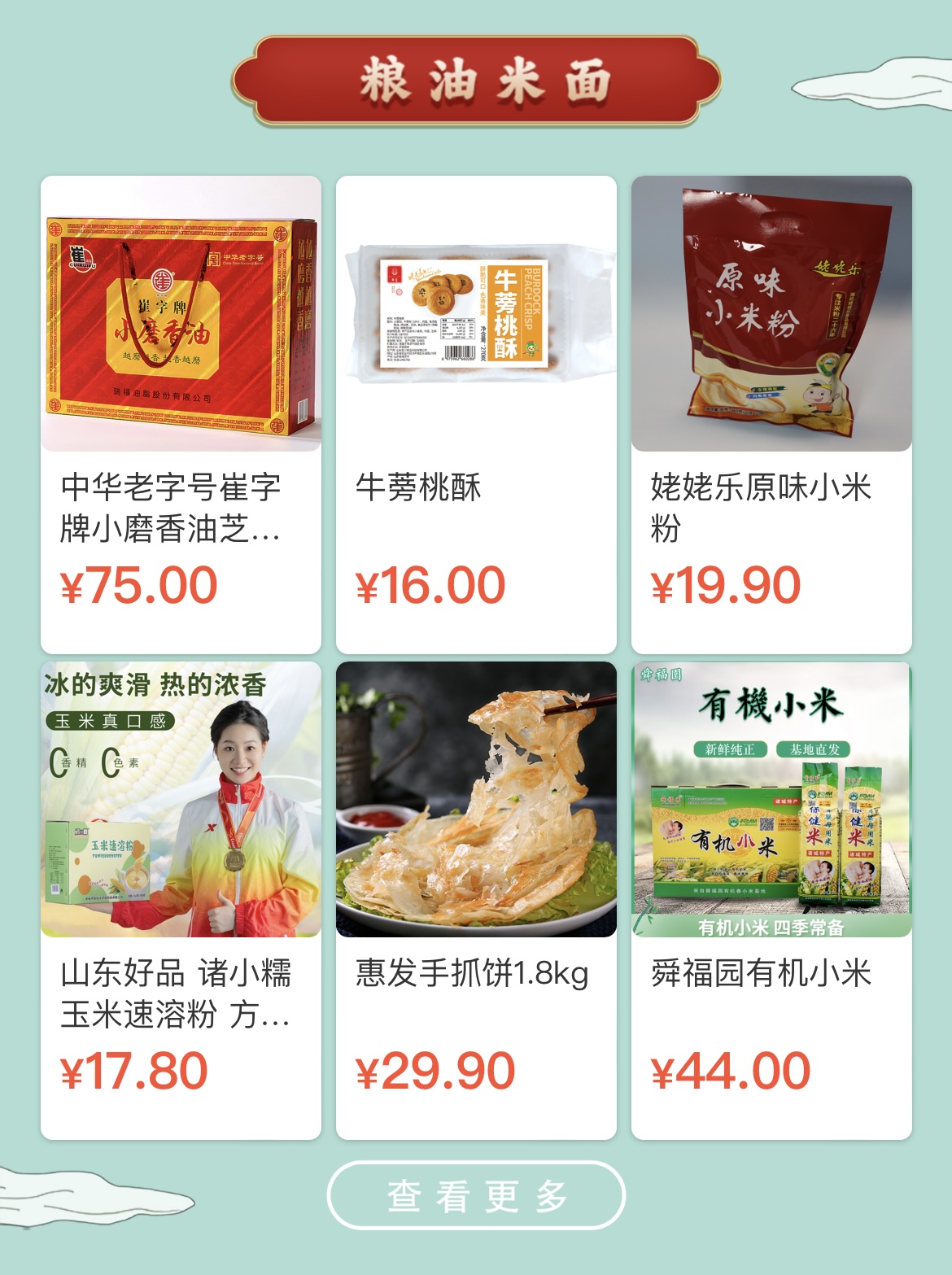 在“粮油米面”板块,香油、手抓饼、米粉、小米、速溶粉、桃酥、糯米粥、粮食酒等各类农副产品应有尽有,满足消费者的日常生活所需。