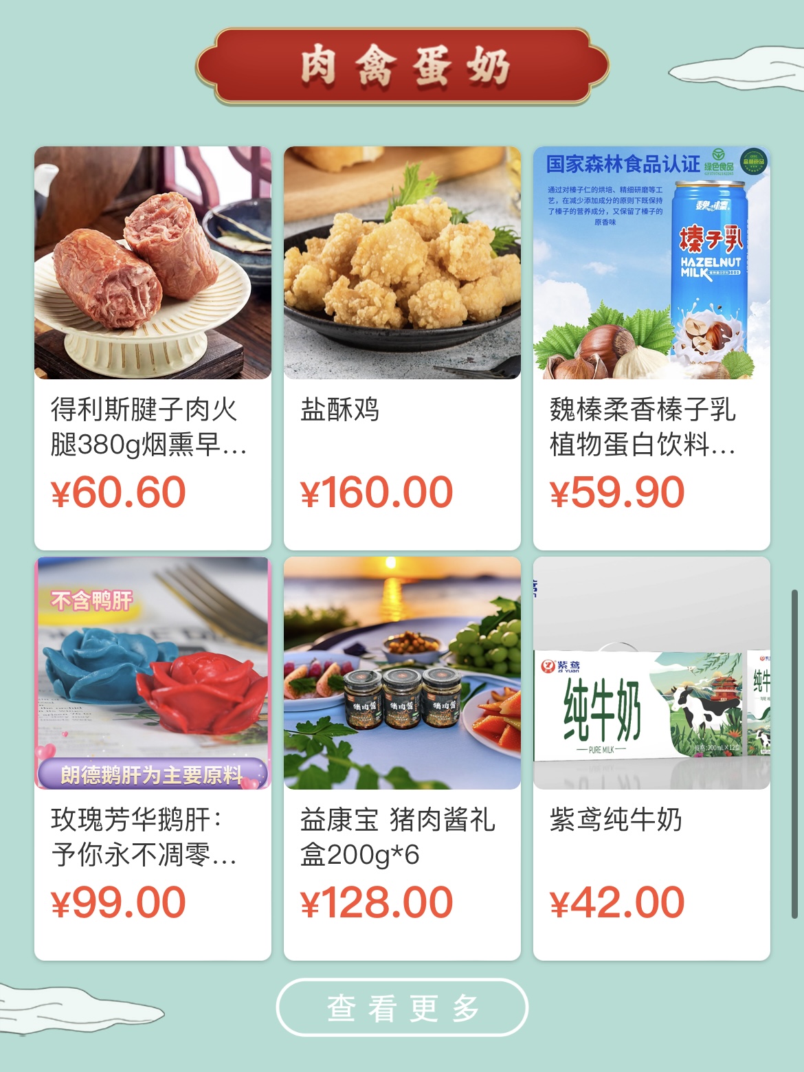 浏览“肉禽蛋奶”板块,首先可以看到的就是消费者们的老朋友——得利斯腱子肉火腿。此外,玫瑰芳华鹅肝、紫鸢纯牛奶等老字号品牌的加入在销量和品质方面提供了保证,消费者在这个板块可以放心“闭眼入”。