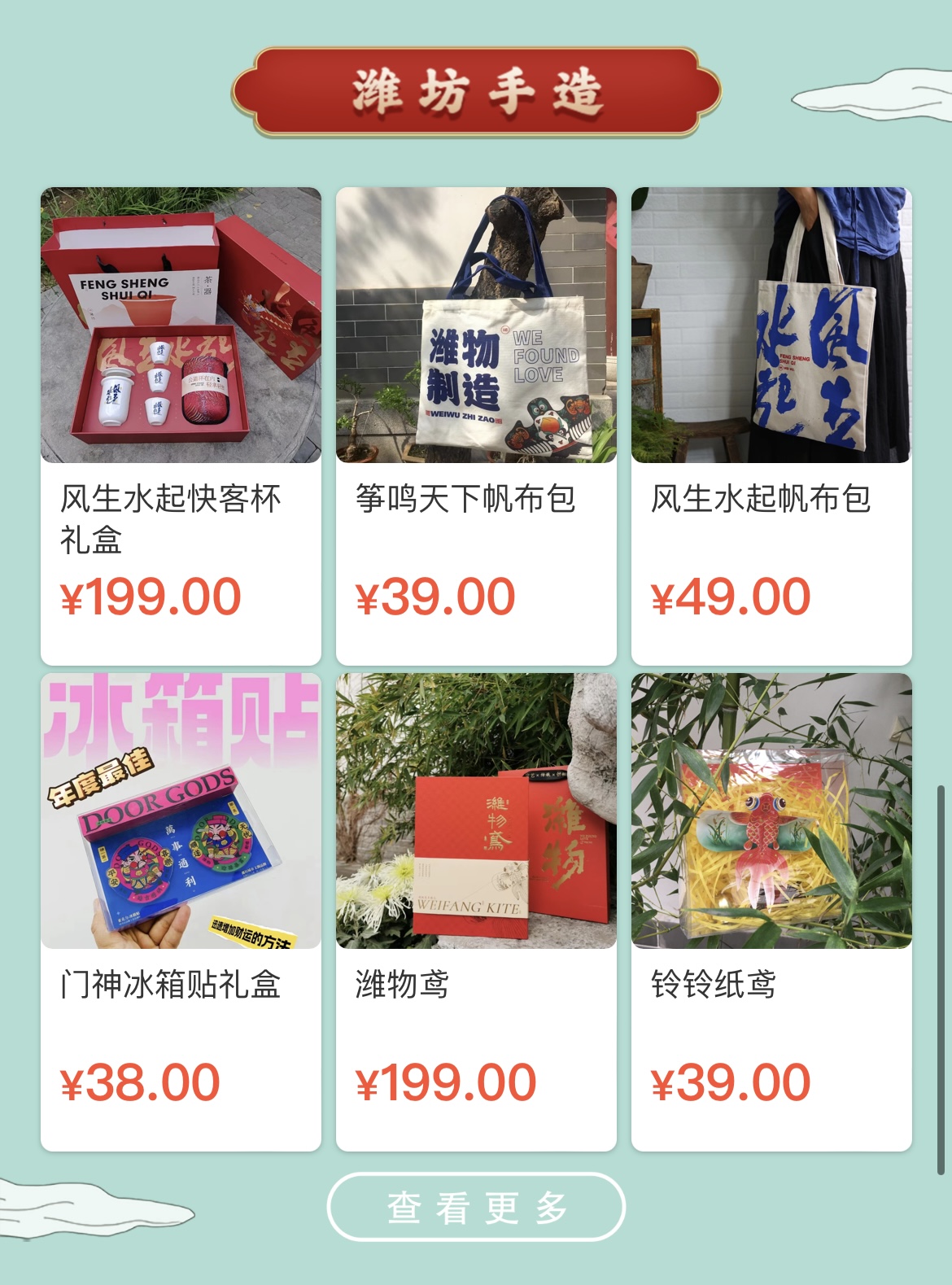 值得一提的是,“潍坊手造”板块包含了筝鸣天下帆布包、风生水起帆布包、门神冰箱贴礼盒、潍物鸢、铃铃纸鸢等具有潍坊特色的手造产品,展现了“手工业与民间艺术之都”的风采。