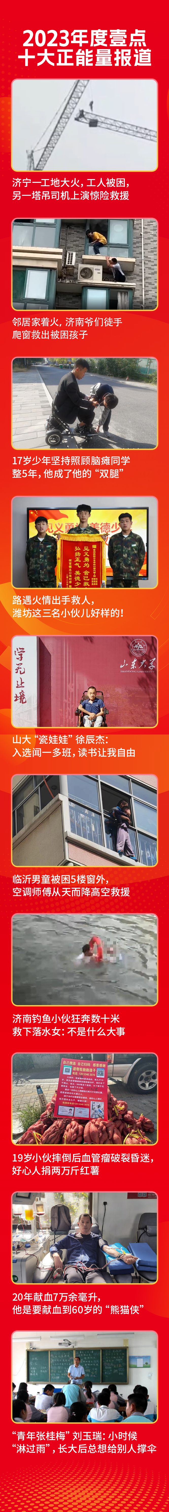 追光而遇,沐光而行!2023年,感人的正能量事件在齐鲁大地时时上演,塔吊司机惊险救援、徒手爬窗救孩子、狂奔十米勇救落水女……一个个正能量故事成为弘扬齐鲁大地“真善美”的靓丽名片。