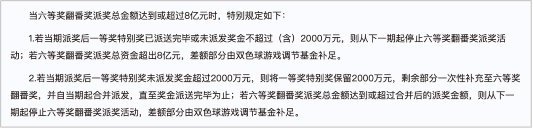 根据本次双色球派奖规则【当六等奖翻番奖派奖总金额达到或超过8亿元时】将执行特别规定。