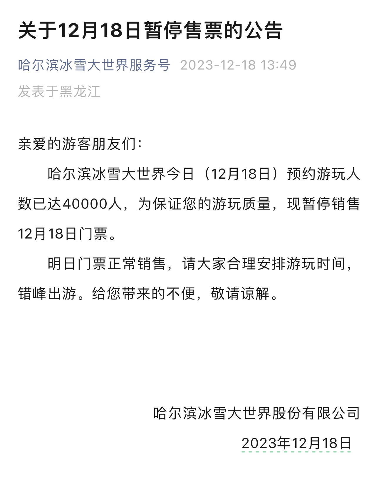 前一日是哈尔滨冰雪大世界开园首日,据哈尔滨冰雪大世界于当日13时49分发布的消息显示,预约游玩人数已达40000人,暂停销售当日门票。