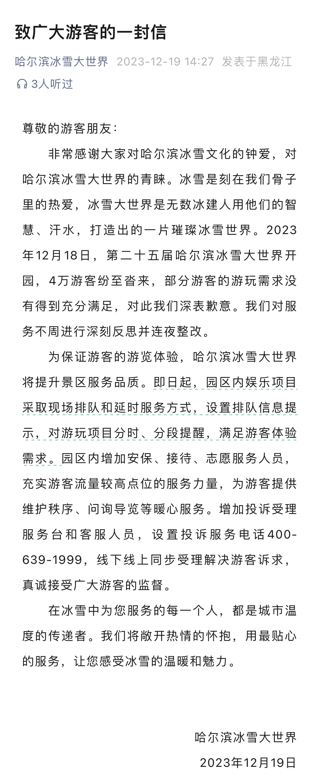 12月19日,哈尔滨冰雪大世界在《致广大游客的一封信》中表示:“为保证游客的游览体验,哈尔滨冰雪大世界将提升景区服务品质。即日起,园区内娱乐项目采取现场排队和延时服务方式,设置排队信息提示,对游玩项目分时、分段提醒,满足游客体验需求。园区内增加安保、接待、志愿服务人员充实游客流量较高点位的服务力量,为游客提供维护秩序、问询导览等暖心服务。”