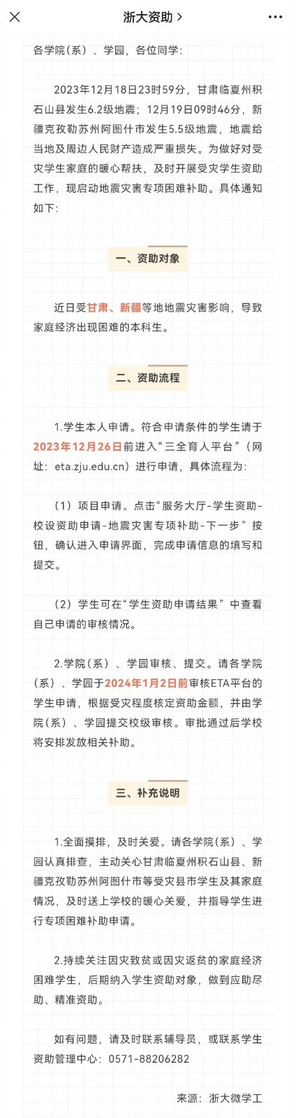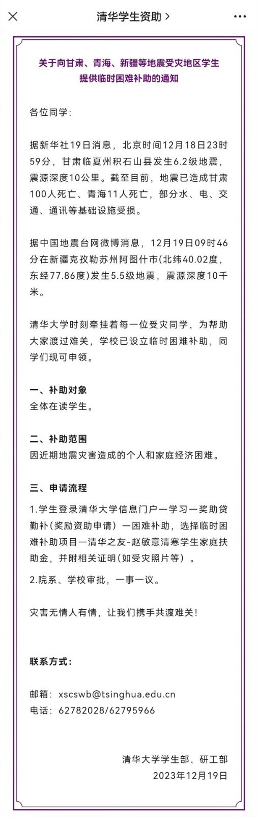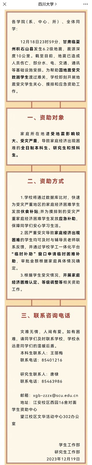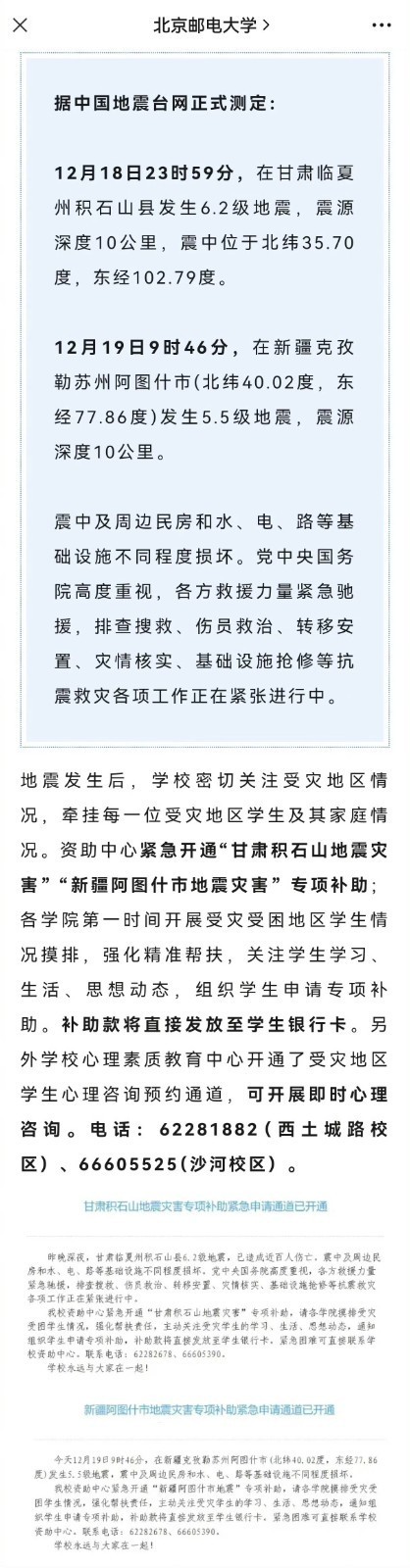 12月18日23时59分,甘肃临夏州积石山县发生6.2级地震。每一位受灾学子的情况,都牵动着大家的心。多所学校第一时间设立临时困难补助,帮助因地震受灾致困学生渡过难关。