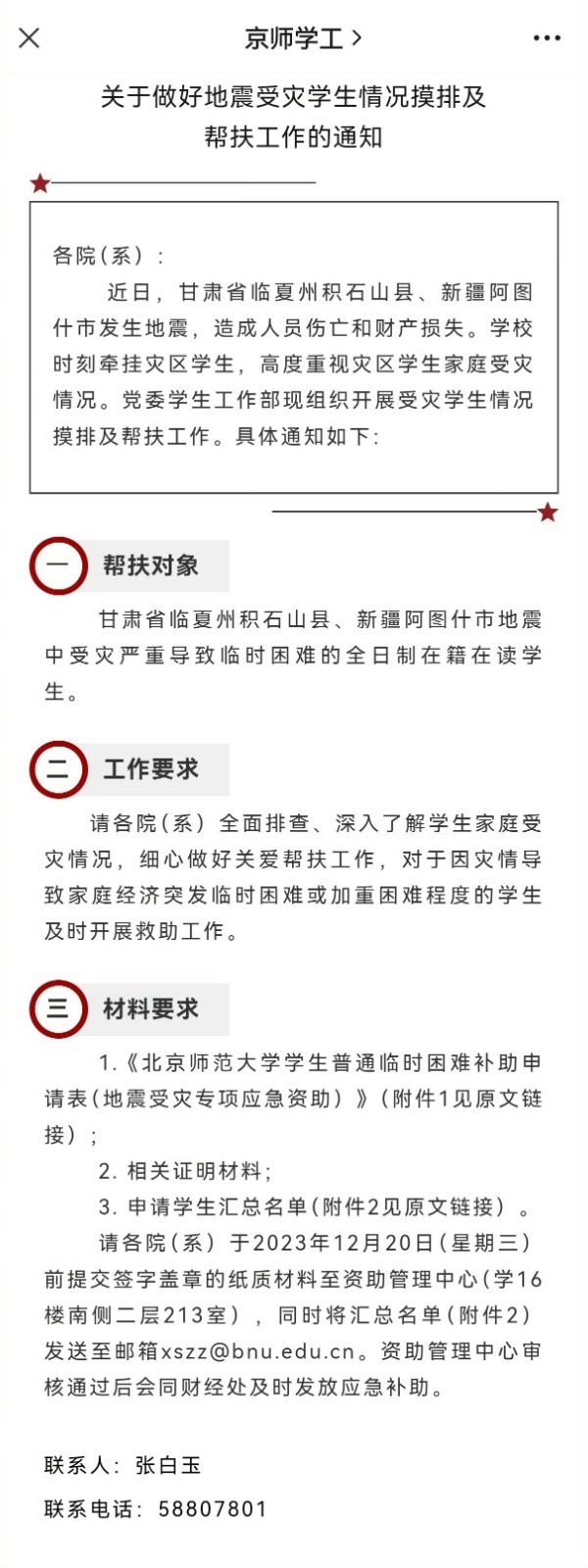 兰州大学快速启动受灾学生摸排工作,开通“甘肃临夏州积石山县地震受灾学生临时困难补助”专项通道。受地震影响,导致家庭经济出现困难的在读本科生,即日起可登录学工系统,点击“资助申请”—“甘肃临夏地震受灾学生专项通道”进行受灾专项资助申请,经学生奖助中心审核后,学校将参照学生临时困难补助标准确认并发放补助金。