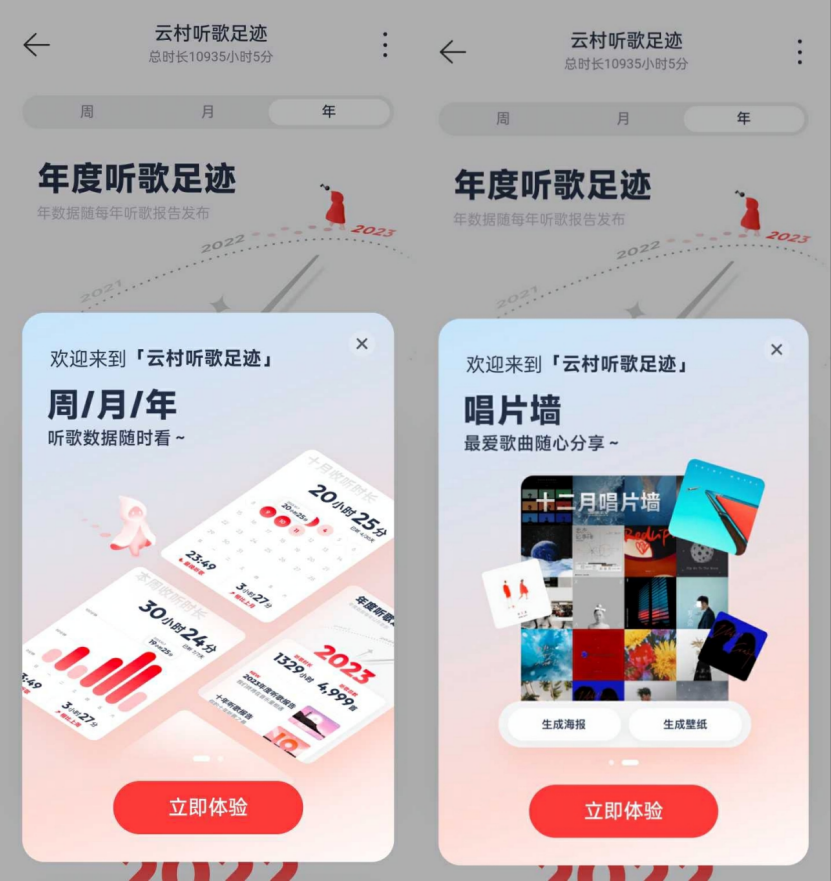 网易云音乐2023年度听歌报告结尾,还发布了“云村听歌足迹”特别惊喜,此后用户可每天查看听歌数据。云村听歌足迹以周、月、年为单位,收录了用户不同阶段的细分音乐人、听歌年代、最爱歌曲等听歌偏好,并推出唱片墙,用户可下载唱片墙设为手机壁纸或屏保。