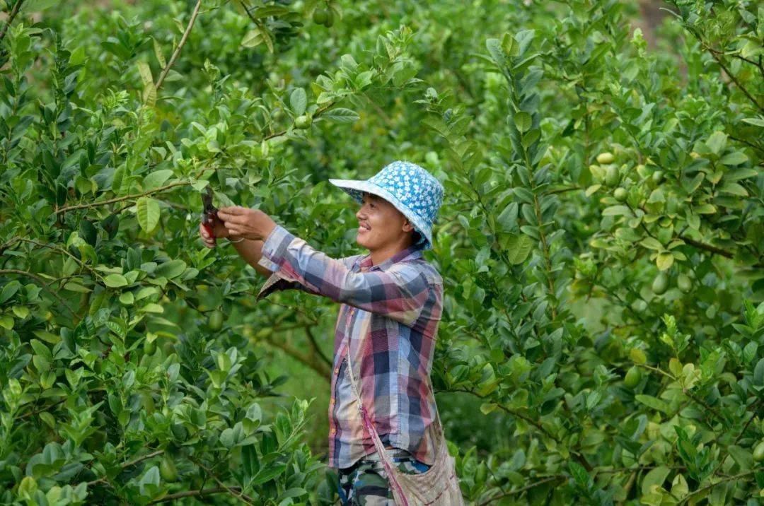 图说:香水柠檬基地,农户在山间作业,及时采摘符合古茗标准的柠檬果。