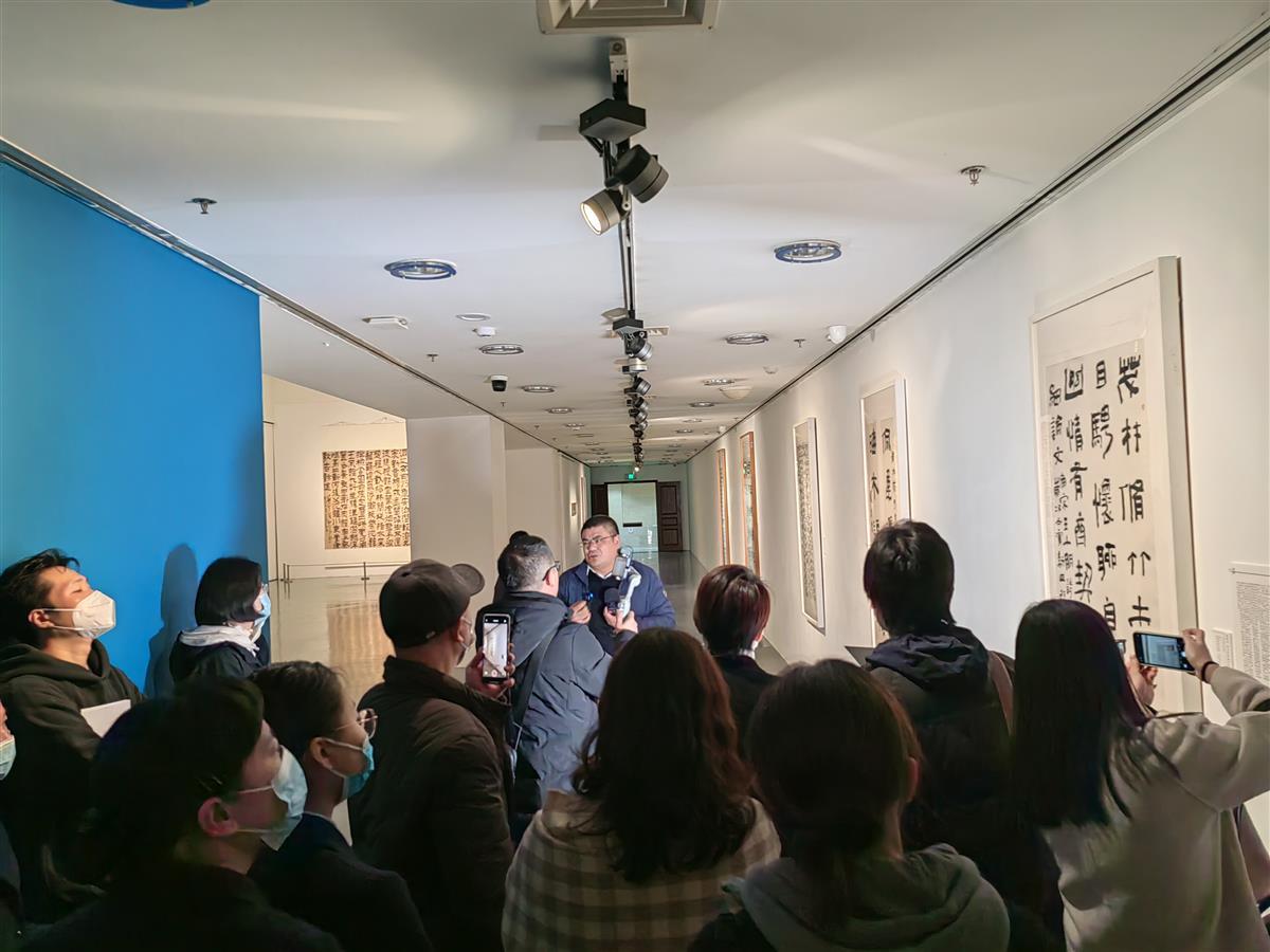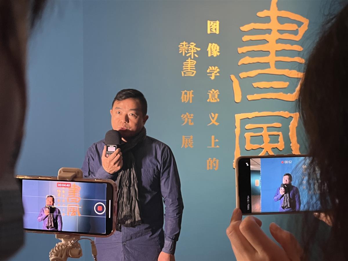 《书风》策展人、武汉美术馆展览部主任张文博为媒体导览展览作品