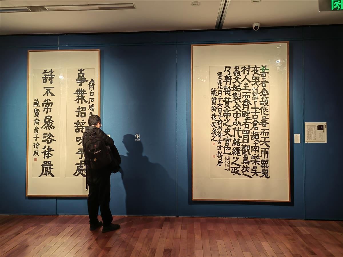 张文博介绍,展览本身就是一条大的梳理线,且在每个单元、每个书法家的呈现上也有梳理的脉络。比如,在当代隶书单元,张文博邀请每位书法家除了提供创作作品外,还需提供一件临帖作品,这样观众就可以看出每个书法家“是从哪里来的”,怎样从传统中吸收营养从而形成自己的风格。