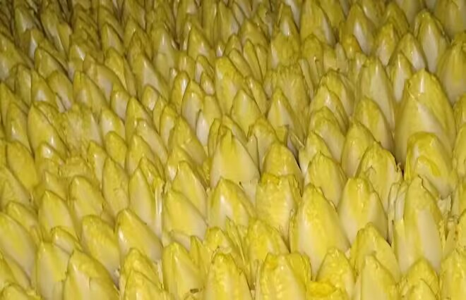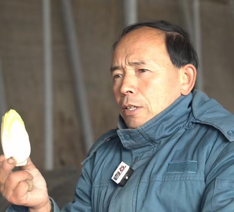 刘玉忠告诉记者:“我2000年开始尝试种植芽球菊苣,从最开始的三五亩地,到现在已经发展到了八十亩地,年产量10万多斤,现在金黄色的芽球菊苣售价12元一斤,紫红色的24元一斤。芽球菊苣是分期分批收获的,从元旦前开始收获,一直能持续到来年三月份。”