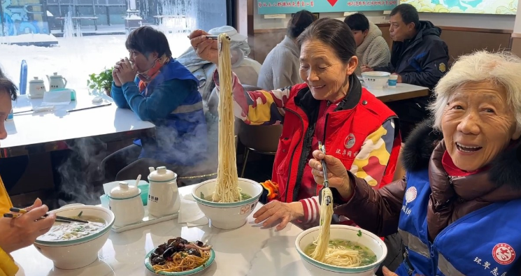 同样是今天中午,环翠楼街道东北村社区里暖意如春。“喝了这碗拉面,心里真是暖呼呼的,下一次扫雪格外有劲儿,哈哈哈……”放下手里的清雪工具,走进拉面店内坐下,东北村社区居民黄祖莲活动了一下冻僵的手指,吃起热气腾腾的爱心拉面。这是社区联合辖区爱心商户麦芽棱兰州牛肉拉面老板马文吉泥为清雪志愿者和环卫工人们准备的。