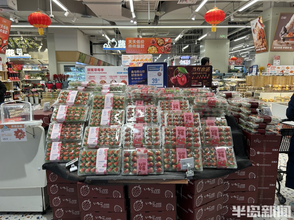 盒马鲜生店中,草莓被摆放在“C位”。
