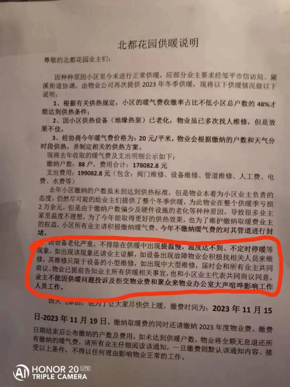 随后业主告诉记者,物业又发了供暖说明,开始收取供暖费。在《说明》中写到,小区的暖气费收缴率占比不低于小区总户数的48%才能达到供暖条件,同时,物会根据缴纳的户数和天气分时段供热。此外,因为设备老化严重,不排除在供暖中出现提温慢、温度不达标、不定时停暖等现象。