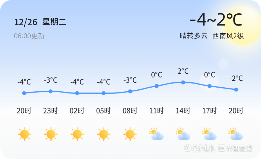 【威海天气】12月26日,寒冷,晴转多云,西南风2级