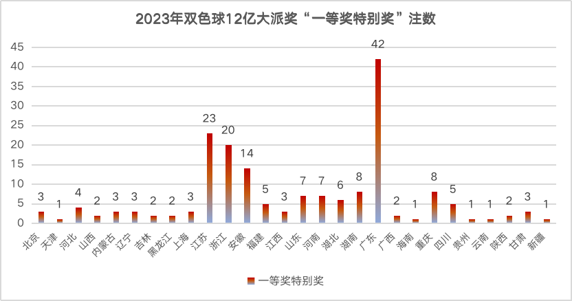 一等奖特别奖中出省份为:北京3注,天津1注,河北4注,山西2注,内蒙古3注,辽宁3注,吉林2注,黑龙江2注,上海3注,江苏23注,浙江20注,安徽14注,福建5注,江西3注,山东7注,河南7注,湖北6注,湖南8注,广东42注(含深圳3注),广西2注,海南1注,重庆8注,四川5注,贵州1注,云南1注,陕西2注,甘肃3注,新疆1注。