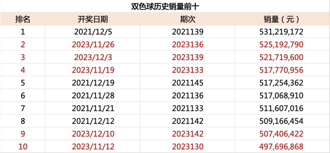 多期销量超5亿元,5期销量位列历史前十。派奖期间,多期销量位列历史销量前十,其中有四期销量超过5亿元,双色球第2023136期(派奖第8期),单期销量超过5.25亿元,位列历史第二。