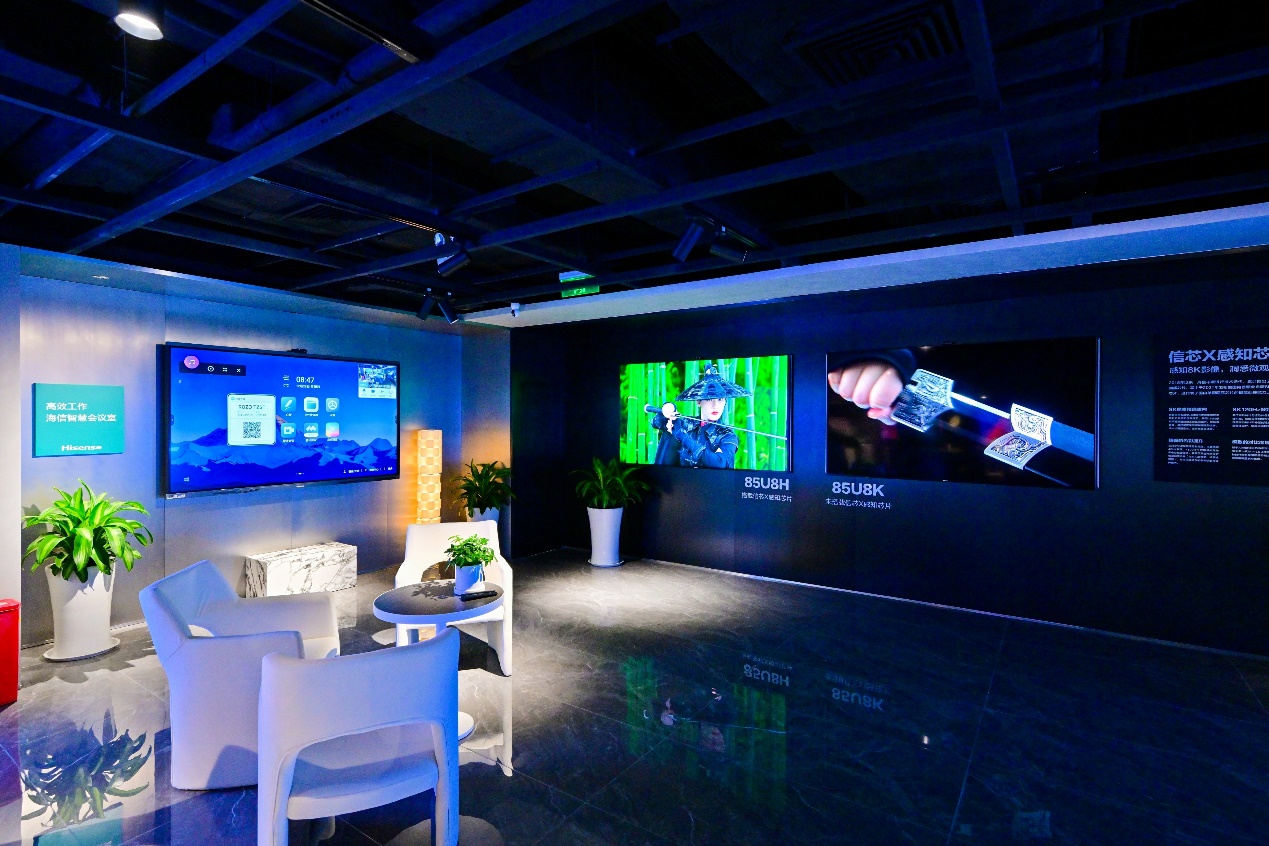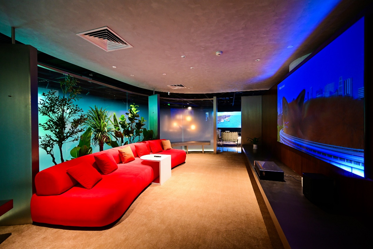 激光影院中,旅客正倚靠在沙发上,欣赏海信激光电视中播放的热门影视剧,全套定制哈曼卡顿音响系统,7个扬声器,3路功效,搭配360°环绕立体声场,综合视听体验可达影院级,还原电影原色原声,为追求极致观影体验的旅客提供了一场视听盛宴;在智慧办公区,商务人士可利用海信智慧会议平板一键入会,从手机的小视角,变身专业音视频会议大场面,在5G、超高清、人工智能等技术的加持下,享受一场智能高效的沉浸式会议体验。