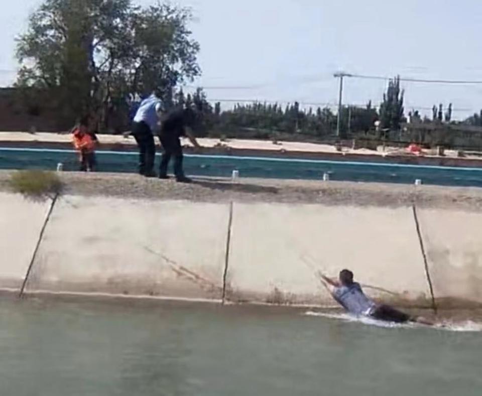 2023年8月18日,在新疆库尔勒市十八团渠上户镇一渠段,一名13岁少年意外失足落水。千钧一发之际,53岁的潍坊汉子杨传义奋不顾身、纵身跃入水流湍急的渠道,一次次将孩子从水中托起,使孩子的头一直保持露出水面。
