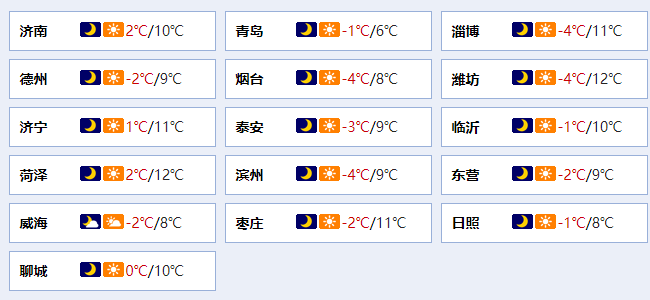 最低气温:鲁中山区和半岛内陆地区-5℃左右,聊城、菏泽和济宁1℃左右,其他地区-2℃左右。