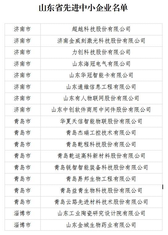 山东省工业和信息化厅日前公示山东省先进中小企业名单。经过企业自主申报、各市推荐、专家评审、征求有关部门意见等程序,拟确定包括超越科技股份有限公司、济南金威刻激光科技股份有限公司在内的100家企业为山东省先进中小企业。