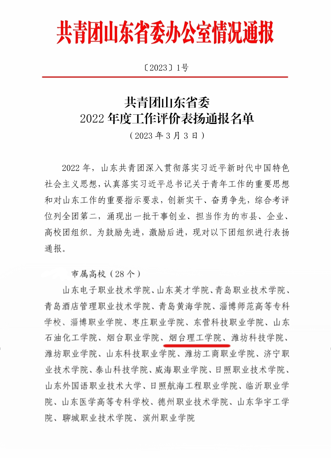 3月,我校2022年度共青团工作被共青团山东省委通报表扬。6月举行2023届毕业生毕业典礼暨本科生学士学位授予仪式,校长于光辉发表《向上而生,向善而行》毕业致辞。8月,丁天举同学获评2022年度“中国大学生自强之星”。9月举行开学典礼暨军训动员大会。11月开展“校长有约”系列活动,“琴心之声”互动交流平台正式启用。与院格庄街道党团共建大学生社区实践基地,启动青春助力乡村振兴志愿服务项目。
