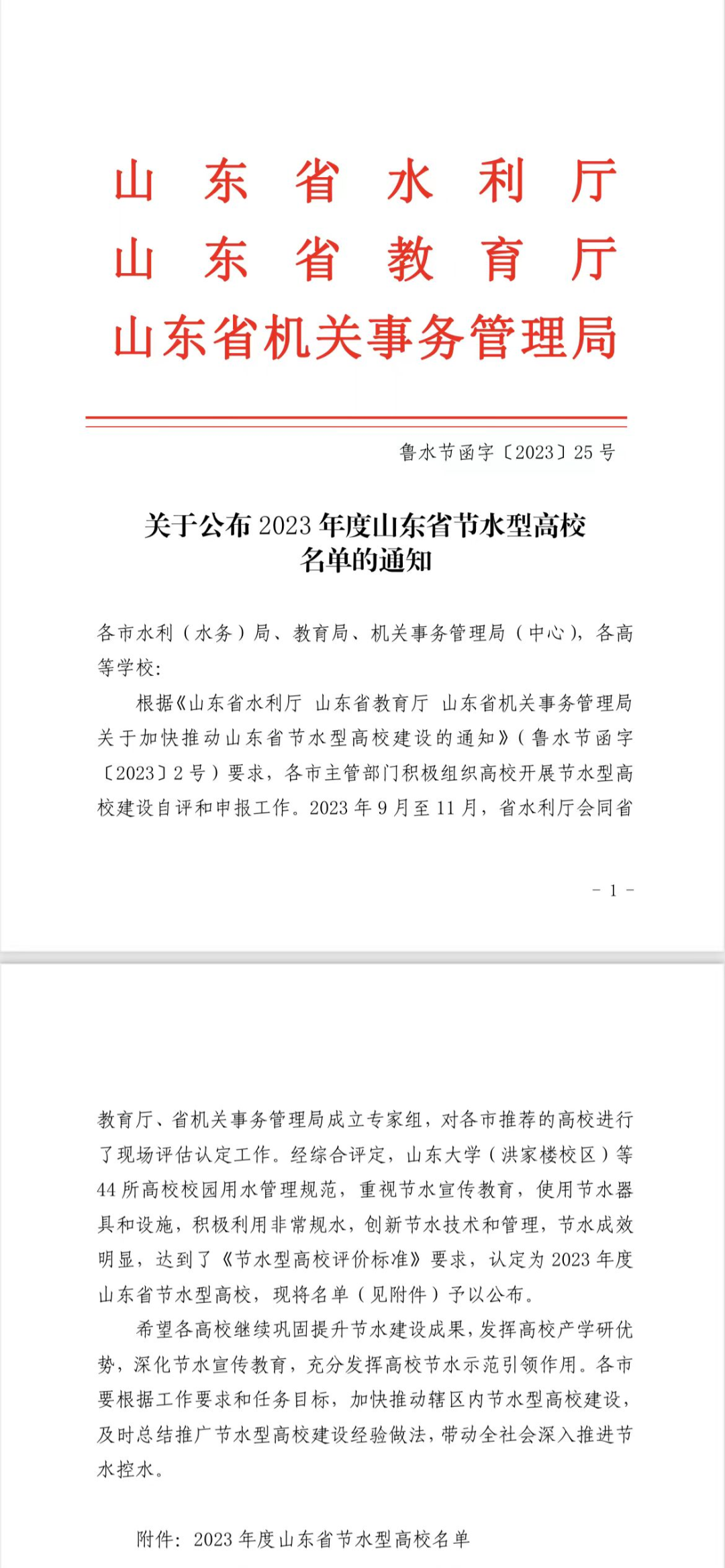 12月,山东省水利厅、省教育厅、省机关事务管理局联合公布2023年度山东省节水型高校名单,我校获评山东省“节水型高校”荣誉称号。