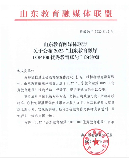 3月,我校微信公众号获评2022山东教育融媒TOP100优秀教育账号。12月召开2023年度优秀网站评选工作表彰暨新媒体联盟成立大会,推进学校新闻宣传工作的高质量发展。学校获评“2023山东最佳社会声誉高校”“2023山东最具影响力教育政务融媒体”称号。