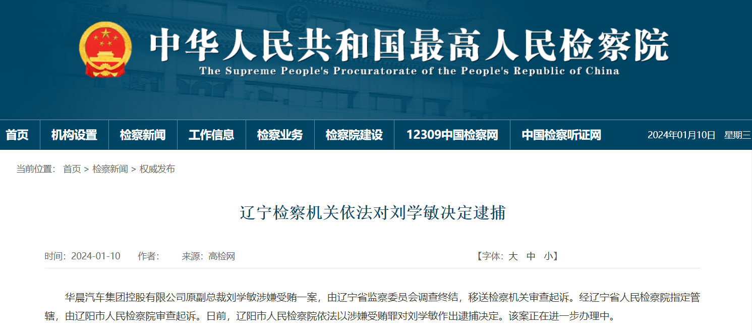 据最高人民检察院网站1月10日消息,华晨汽车集团控股有限公司原副总裁刘学敏涉嫌受贿一案,由辽宁省监察委员会调查终结,移送检察机关审查起诉。经辽宁省人民检察院指定管辖,由辽阳市人民检察院审查起诉。日前,辽阳市人民检察院依法以涉嫌受贿罪对刘学敏作出逮捕决定。该案正在进一步办理中。